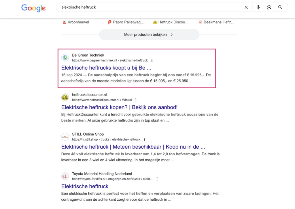 Hier heb ik een aantal recente cases voor je waarbij ik de klant organisch op nummer 1 in Google heb gekregen op een belangrijk zoekwoord. In veel gevallen is dit slechts één voorbeeld en behaalt de klant ook op verschillende andere zoekwoorden hoge posities.