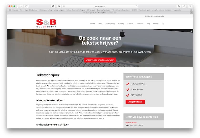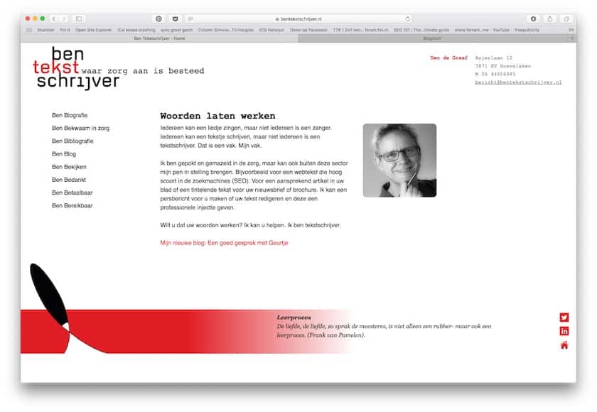 Ik vind een toetsenbord als ‘anchor image’ niet veel sterker dan een typemachine. Het gaat uit van wat je veel doet als tekstschrijver (namelijk achter een toetsenbord zitten), niet vanuit het probleem dat je voor je klanten oplost. Het zet je eerder neer als een tikgeit, zoals die op sommige freelancemarktplaatsen gevraagd worden (’tien teksten van minimaal vierhonderd woorden als vulling voor mijn website’).