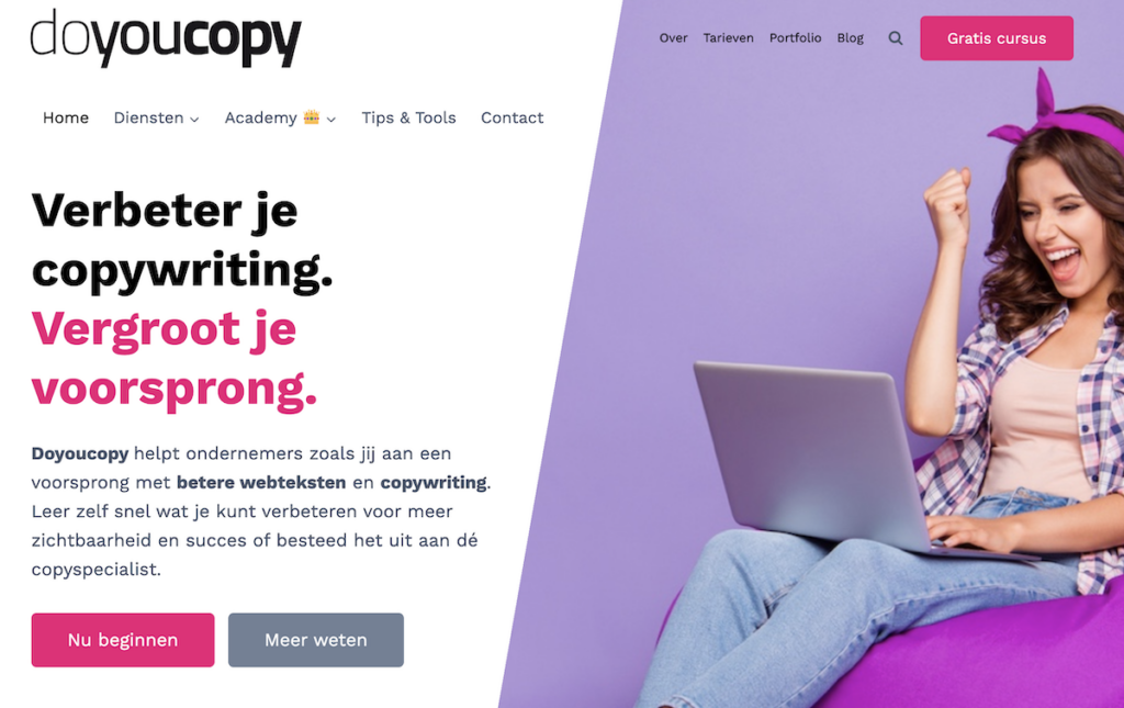 Eerlijk gezegd wilde ik een stap terugdoen van het hele freelance copywriter-gebeuren. Dat was precies waar mijn homepage op gericht was: het aanbieden van mijn diensten als copywriter: schrijven in opdracht en het verkopen van mijn cursussen.