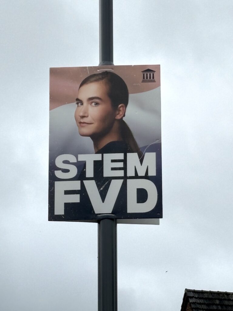 De laatste dan, ook al is de kans groot dat deze partij niet of met misschien slechts één zeteltje terugkeert in de kamer. Het is ook lastig met een frontman die de partij wás en die haar verlaten heeft. Nu staat het hoofd van Eddy van Hijum op de verkiezingsposter.